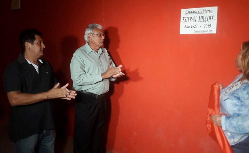 Al ingreso del estadio cubierto se descubrió una placa, con el nombre del dirigente y los años 1927 - 2019.