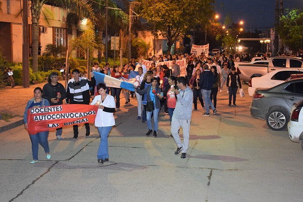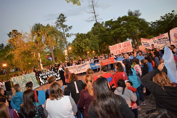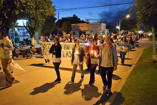 el encuentro comenzó a las 19 hs en el playón cívico de la plaza Sarmiento y, a su término, comenzó la marcha con antorchas, siguiéndole ayer el Banderazo desde las 09:00 en el cruce de Ruta Nacional 89 y Provincial 6 con docentes de toda la zona.