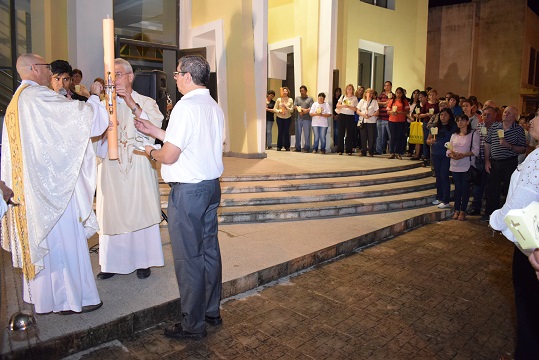 El Sábado Santo fue la celebración de la Vigilia Pascual con la ceremonia inicial de la bendición del fuego por parte del párroco Cristián Casamitjana, el encendido del Cirio Pascual que fue ingresado al templo por el diácono permanente Omar Zenoff invocando “Luz de Cristo”, acompañado por los fieles que portaban cirios que también fueron encendidos antes del ingreso.
