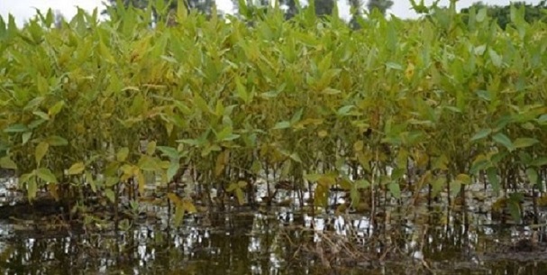 Las lluvias de marzo y abril anegaron lotes de soja en estadíos más avanzados y “los daños son mayores, ya que se produce la pérdida de vainas y flores o, incluso, una defoliación que se traduce en una potencial importante pérdida de crecimiento”.