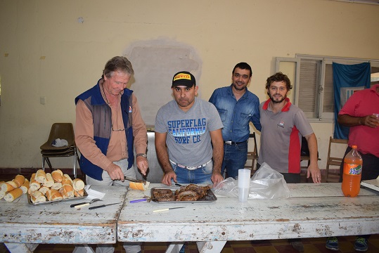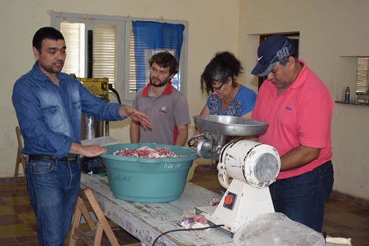 Asistieron productores de distintos parajes de los departamentos 9 de Julio, Chacabuco y General Belgrano, quienes participaron activamente de los distintos momentos del proceso; quitaron la carne de dos animales que se habían faenado totalizando unos 27,5 kg a lo que se agregó 7,8 kg de tocino y condimentos como sal, ají molido, pimienta, nuez moscada, ajo, vino y salitre seco.