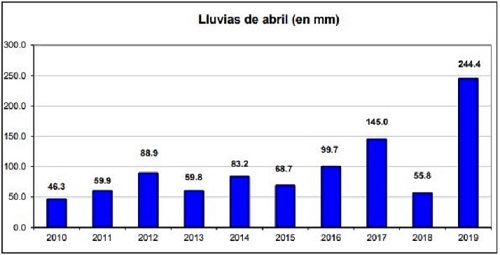 El gráfico demuestra el nivel de lluvias de abril, comparado con el mismo mes del último decenio