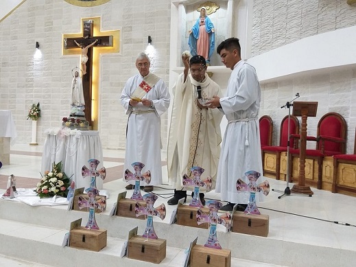 El presbítero Rogelio García bendice las cruces vocacionales que fueron entregadas a cada capilla
