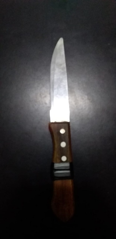 Cuando llegó la policía e intentó detenerlo, se resistió por lo que debieron reducirlo y colocarle esposas, lo llevaron a la guaria de emergencias donde el médico de turno constató su estado de salud. Entre sus prendas de vestir se encontró un cuchillo de 25 cm de largo con hoja de 1,5 mm de espesor, con filo tipo casero y sin vaina, lo que le fue secuestrado por los uniformados con testigos que constaron la acción.