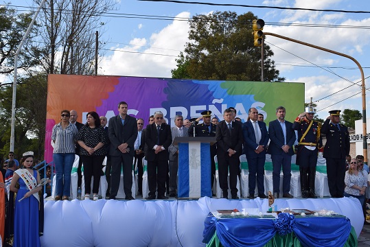 A la tarde y con la compañía del gobernador Domingo Peppo se realizó el acto central de la festividad que reconoció a vecinos destacados y cerró con un pasaje cívico musicalizado por las bandas “Ituzaingó” de Buenos Aires y la Municipal de Las Breñas.