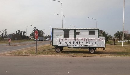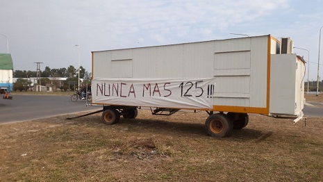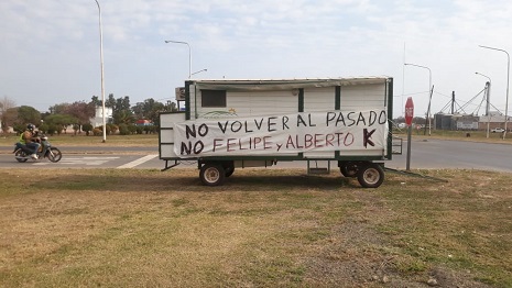 En las casillas se observaban carteles con frases como “No volver al pasado, no Felipe y Alberto K”, “Por más producción, más pan en la mesa de los argentinos”, “No volver al pasado, chau Felipe Solá”, “Nunca más 125”, entre otras.