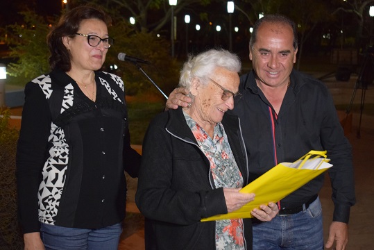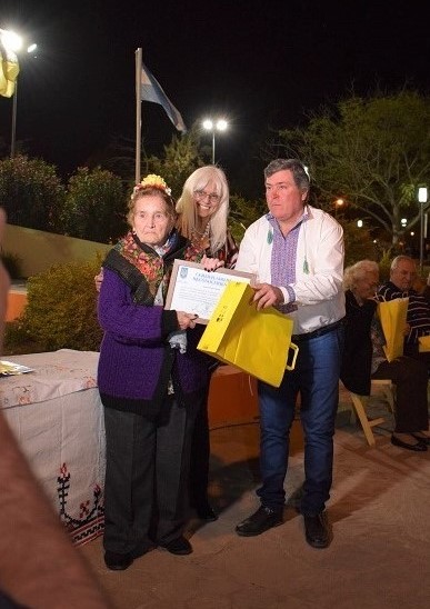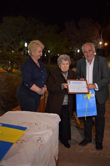 Nina Gruszcki viuda de Zaderej, nacida el 14 de septiembre de 1933 en Cremenski, provincia de Volinia; llegó a la Argentina cuando tenía 4 años junto a su familia en el vapor Kotivzko, viviendo en colonia Juan Lavalle y en lote 13 de La Clotilde; se casó con Joaquín Zaderej, radicándose en Pampa María; hoy tiene 86 años, madre de Ana María, Víctor Ángel y Rosa Mirta, tiene 6 nietos y 8 bisnietos; y recibió el presente de manos del jefe comunal Omar Machuca.