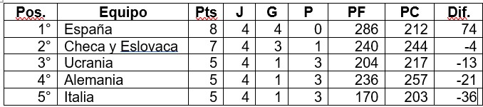 En la tabla de posiciones, hubo un triple empate entre Ucrania, Alemania e Italia. La diferencia de puntos de los partidos jugados entre ellos determinó el siguiente orden: 3º Ucrania +15, 4º Alemania 0, 5º Italia -15