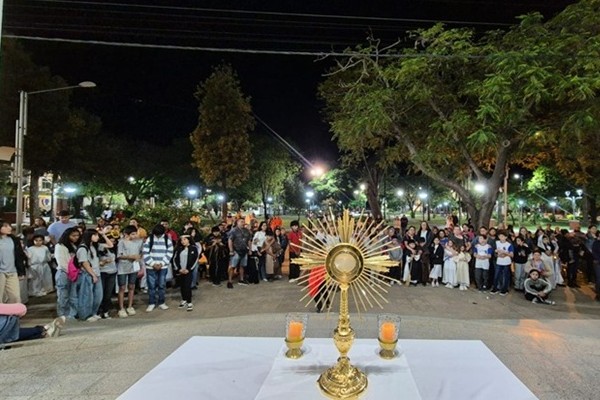 En el sector de la calle Rivadavia, entre el atrio del templo parroquial y la plaza Sarmiento, a partir de las 21 hs fue la animación, presentaciones y charla; a las 22 se preveía la cena con la familia y amigos; y a las 22:30 la Vigilia de Adoración al Santísimo Sacramento.