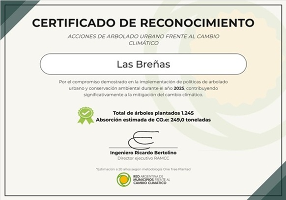 El Gobierno Municipal de Las Breñas recibió un Certificado de Reconocimiento de la RAMCC (Red Argentina de Municipios frente al Cambio Climático) por sus acciones de arbolado urbano y compromiso ambiental durante el 2025, contribuyendo significativamente a la mitigación del cambio climático.
