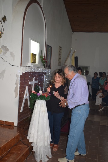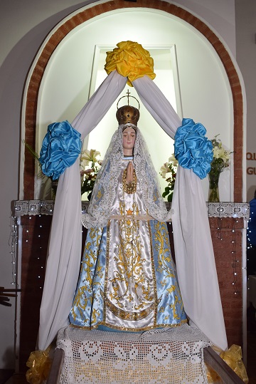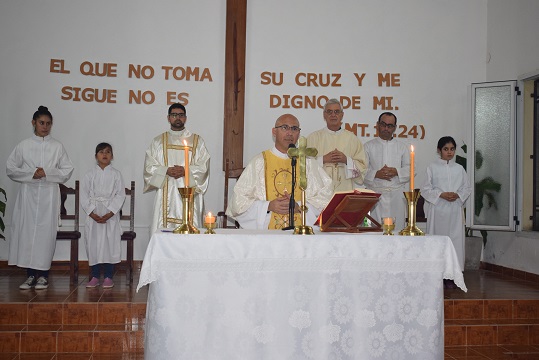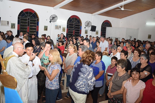 Luego, se hizo descender del móvil a la imagen de la Virgen y se ingresó al templo que estaba totalmente cubierto de fieles y con el ministerio de música dirigiendo los cánticos ingresó el celebrante, padre Cristián Casamitjana, acompañado por los diáconos Omar Zenoff y Fabricio Jara, y el grupo de monaguillos y lectores.