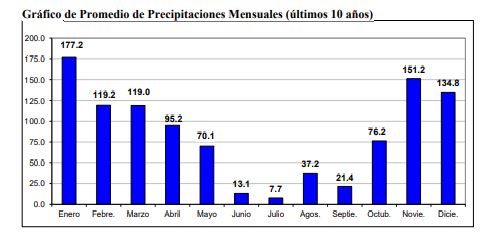 Otro dato por observar es la distribución mensual de las lluvias; el gráfico indica el comportamiento en 2019 y se puede comparar con el promedio de los últimos 10 años.