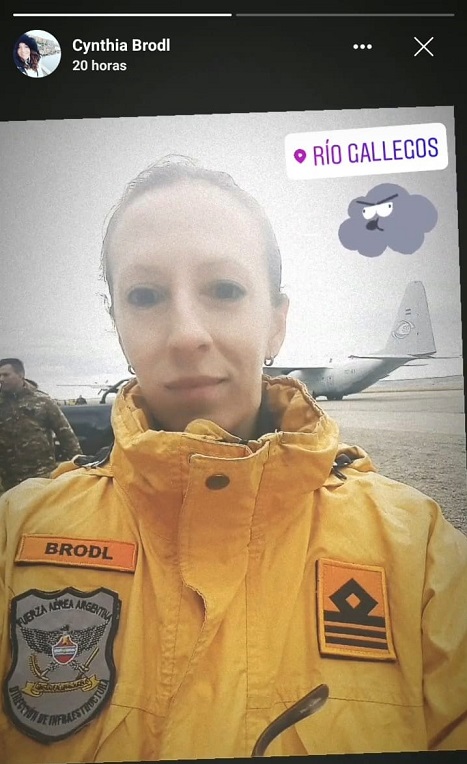 Primer teniente Fuerza Aérea arquitecta Cynthia Brodl en Río Gallegos viajando hacia Base Marambio.