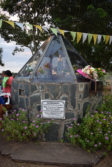 La capilla y gruta que fue realizada en un primer momento fueron construidas en el terreno cedido para tal fin por Juan Carlos Sequenzia e Hilda Nora Sauer de Sequenzia, según reza una placa ubicada al pie de la gruta que, dentro de un espacio vidriado, cuenta con una imagen de la Madre de Dios.