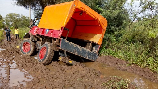 El Unimog de Bomberos Voluntarios terminó en el barro en una de las tareas de ayuda comunitaria