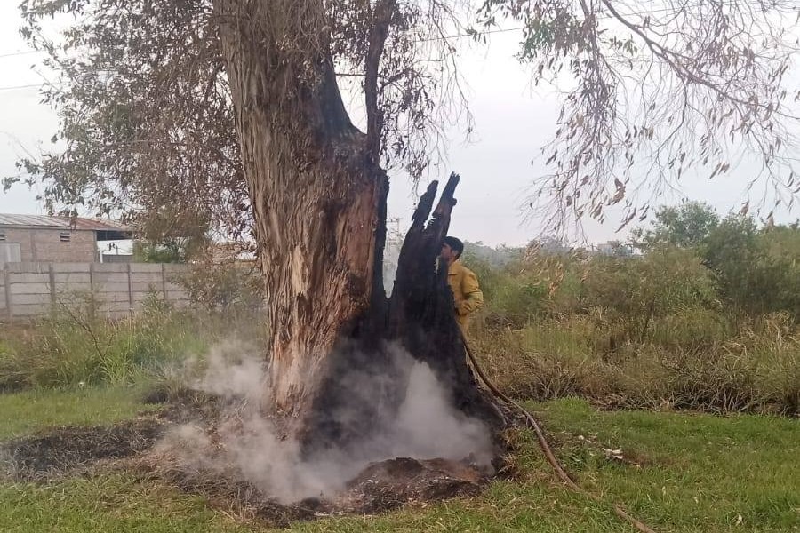 Un par de bomberos voluntarios del cuartel local debió asistir para apagar el fuego en un eucalipto y controlar un incendio de pastizales en la zona del acceso oeste.