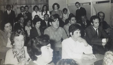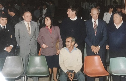Al concluir el sexto año de la carrera, sólo lograron graduarse 13 jóvenes de los originariamente matriculados. Varios de ellos desistieron por razones familiares o laborales; otros se trasladaron a otras provincias y un grupo de ellos completó sus estudios más tarde. En la imagen, primeros egresados en acto de Bodas de Oro: Juan Carlos Incoff, Alejo Onocko, Zulma Itatí Martínez, Roberto Gallucci, Amado Tito García y Raúl Montes junto al primer portero Sr. Ángel Cancino