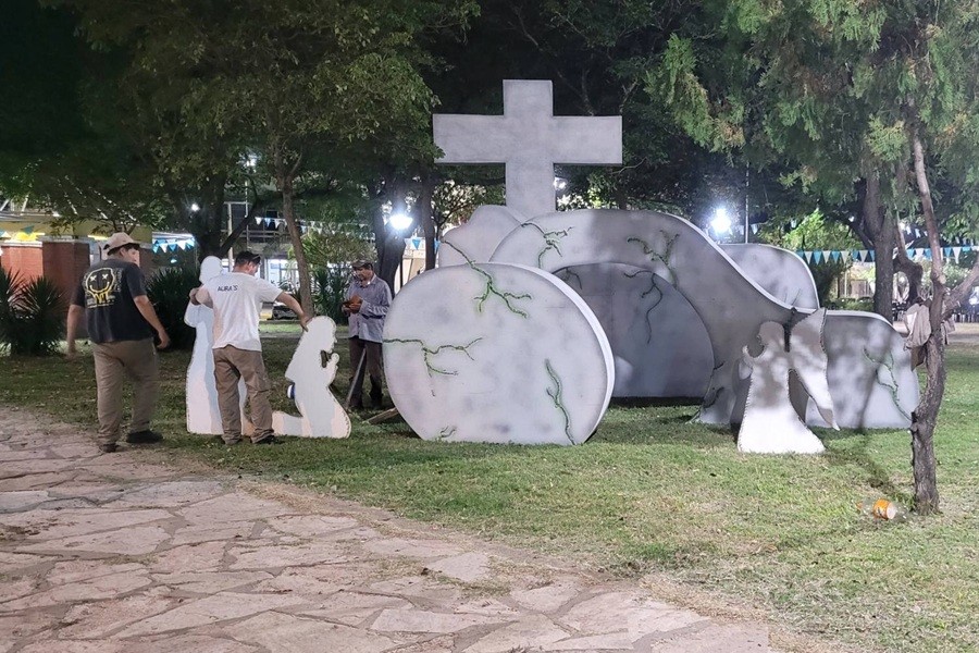 Las celebraciones de la Semana Santa propician la adhesión de instituciones y familias de la comunidad con distintas expresiones; tal es el caso de la instalación de una representación del Santo Sepulcro en la plaza Sarmiento.